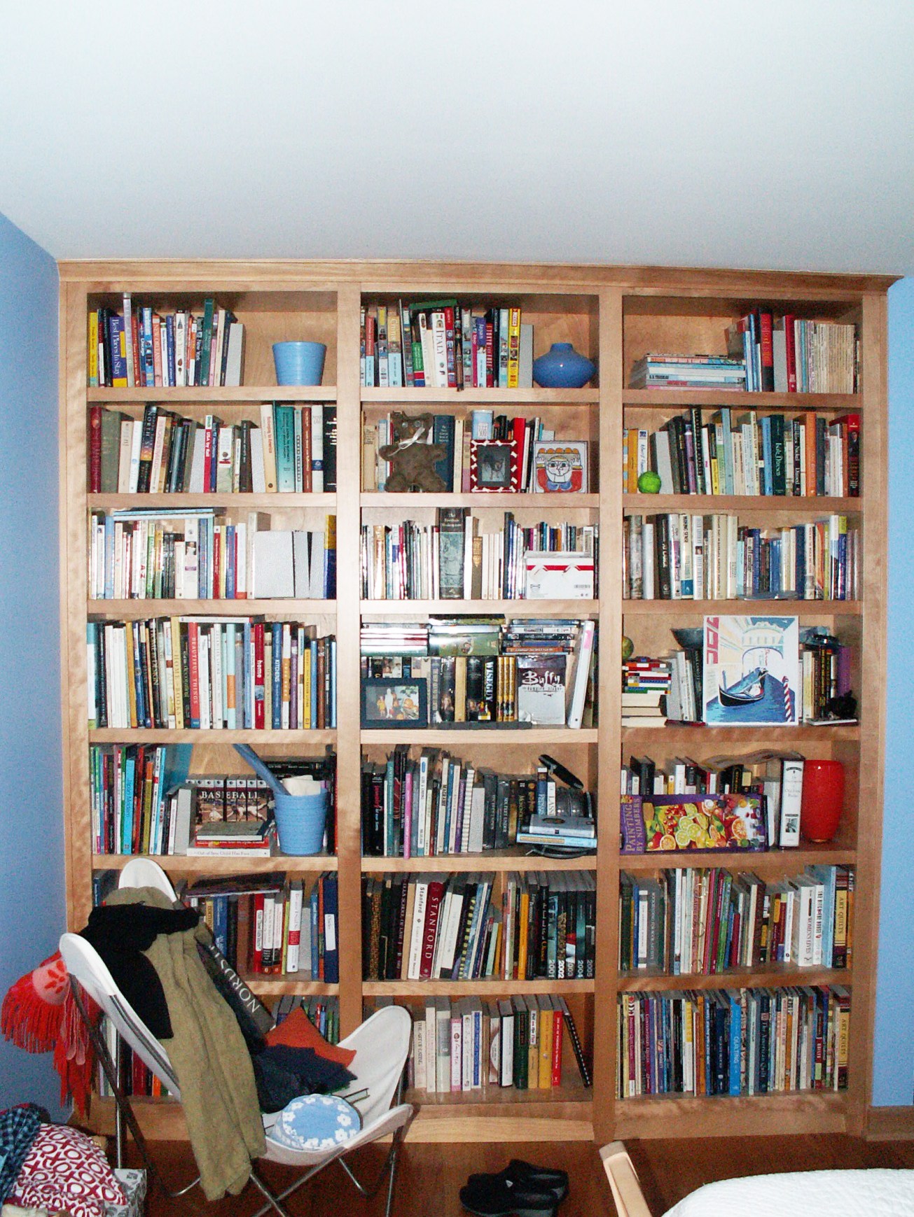 Next Previous Built-In Shaker Style Bookshelf by blossomcarpentry August 9, 2014 Libraries & Offices Solid Maple faceframe Cabinet grade oak veneer stock for interiors Triple unit Floor to Ceiling Span Fits under hard-to-fit space under eaves Related