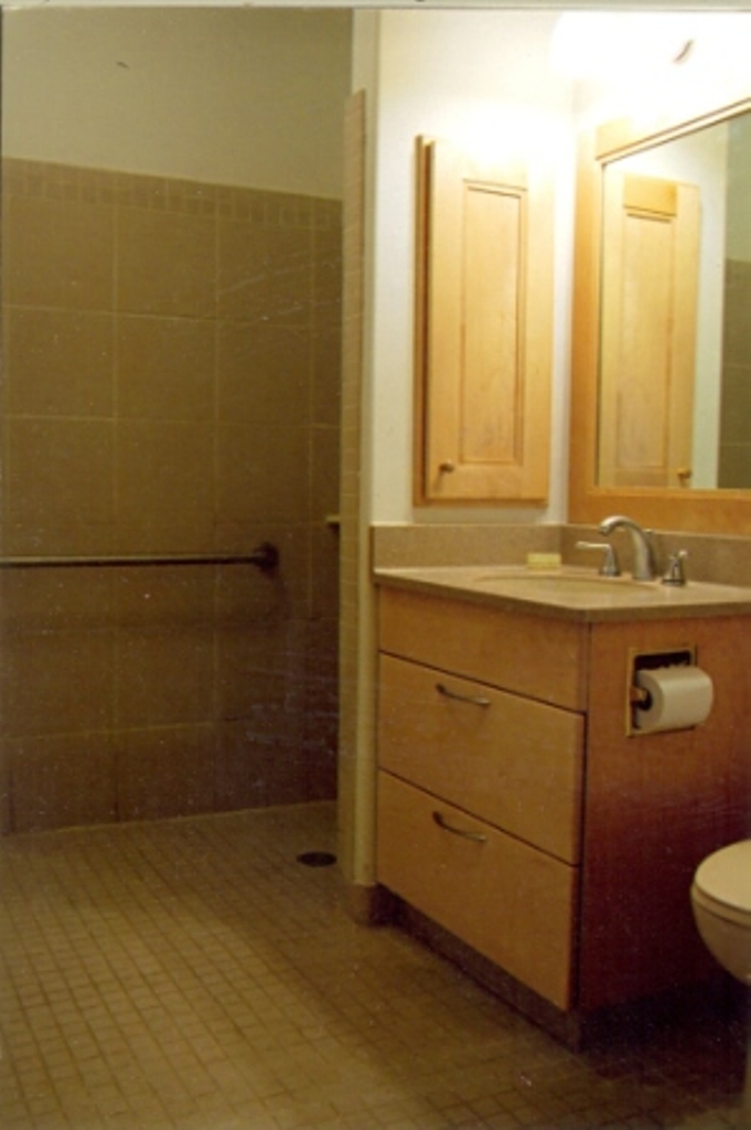 - Custom vanity with Corian countertop has drawers for easy access to supplies