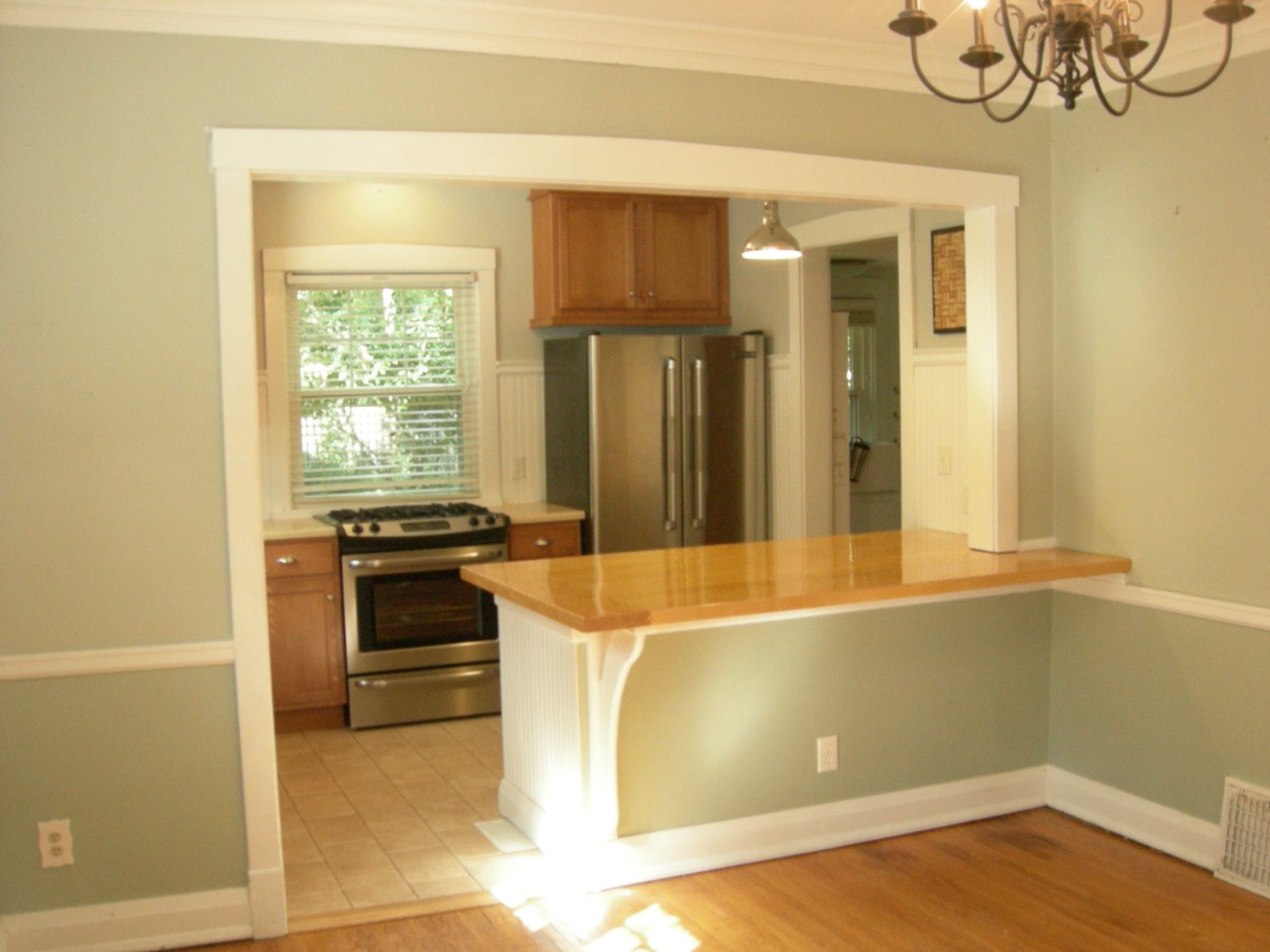 A galley kitchen was opened up by removing a wall and adding a bank of cabinets with maple butcher block countertop. Beadboard paneling, peaked casing and countertop breadboard end with exposed pegs complement the cottage bungalow style.
