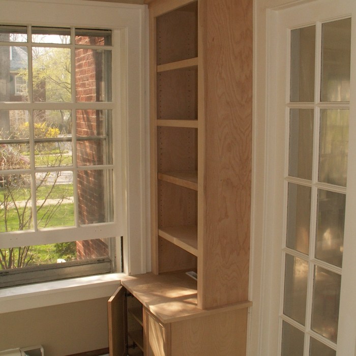 Clean white toned Maple wood Lower cabinets have recessed panel doors Devised floating upper shelving for airy feel and artsy display Designed special cabinet to go in front of window to disguise poor view. Cabinet has glass bottom to allow light filtration. Wine storage above refrigerator box Opened […]